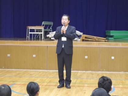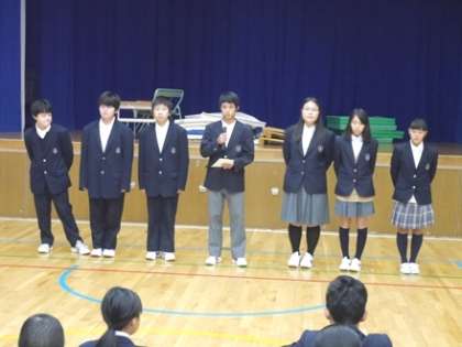 11月10日(月)、今日の生徒集会は8年生生徒会役員、7年生執行委員が1年の任期を務めるあいさつで始まりました。校長先生からは、先週参加された「PTA近畿ブロック研究大会大阪市大会」特別分科会のお話がありました。