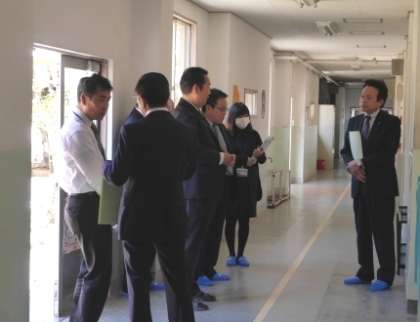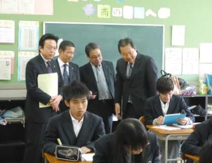 本学園からは『むくのき学園』の特色ある教育内容の説明もさせていただき、9年生の2クラスにおいて、ICTを活用できる教室施設設備の中での授業の様子も参観いただきました。大阪市教育委員会の担当者からは、施設改修全般に関するご質問などに対して、本市の状況説明がされました。
