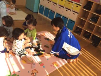 保育園【写真右】では、園庭での遊びや部屋遊び、昼食を一緒に食べるなどの活動を通し、徐々に園児と打ち解けていったようです。それぞれに緊張の初日を終えました。