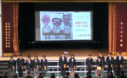 7年生はこの日に向け、「私たちが拓く未来〜私たちがめざす社会〜」というテーマのもと、部落差別について学ぶ「とがった心や言葉がない地球のようなまるい」、多文化共生について学ぶ「誰もが生きやすい社会」、障がいについて学ぶ「ちがいを認め合う社会」の3つのグループに分かれ、学習をしてきました。