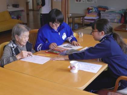 高齢者の介護施設【写真右】では、最初は、なかなかコミュニケーションを取るのは難しかったようですが、折り紙やぬり絵を通して、徐々に会話ができるようになってきたようです。職場体験2日目を迎えてお年寄りの方々も、しだいに表情が和らいできたように感じました。