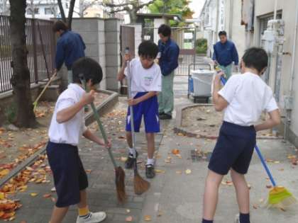 『むくのき学園』の管理作業員室【写真右】では、日頃、学校生活をともにしながら、校内で気づいていなかった仕事内容に関する説明を受け、一緒に校内外の清掃、園芸や修理整備に関する作業を体験することができました。