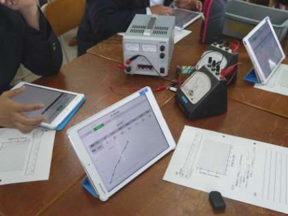 11月21日(金)午後、8年1組は理科【写真左】。「電流の性質」の授業で、オームの法則を確かめるために、実験結果をiPadにまとめ、電流と電圧の間にある規則性を見出していました。9年1組は数学【写真中】。「相似な図形の計量」の授業で、iPad(Keynote)を活用し、相似比と面積比の関係性を見つけ、電子黒板に表示し考えを発表していました。9年2組は国語【写真右】。ICTを活用した「おくのほそ道」の授業で、芭蕉の俳句に親しみを持ち、表現技法に注意しながら大きな声で俳句を読み、繰り返し書くこともしていました。班ごとで使用された『おくのほそ道すごろく』は、興味をひきました。