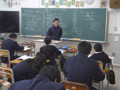 11月25日(火)、中学生は、さあ明日から「期末テスト」です。8年1組、数学の授業【写真左】では、テスト前の復習として「図形の調べ方」の章末問題や、仮定と結論、合同条件など証明の進め方などを再確認していました。9年1組、理科の授業【写真中】では、「地球の運動と天体の動き」で、季節によって星座が移り変わるのはなぜか?という、考察や解説がされていました。