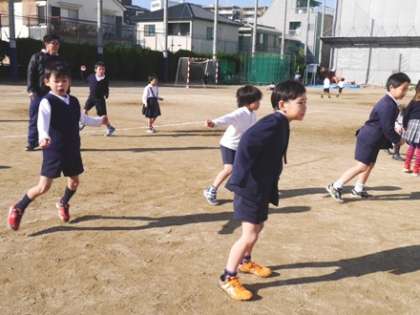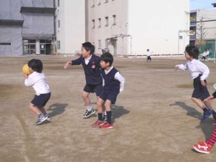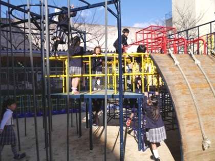 ただ、授業が始まると少しずつ陽光もそそぐようになりました。給食を終えた昼休みには、2年生は運動場に出て、しばらくの間、元気いっぱいのドッジボール遊び。からだが温まる頃には、顔を紅潮させながらも寒風に負けず、ボールを追って元気に駆けていました。また1年生も、中庭にあるコンビネーション遊具で、鬼ごっこをして元気よく遊んでいました。