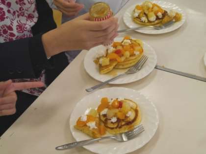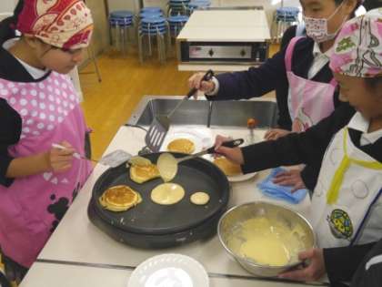 家庭科室では手芸・料理クラブ【写真中・右】が、クリスマスバージョン?の手づくりデコレーションケーキをつくりました。ホットプレートで下地のホットケーキを焼き、生クリームをホイップしたところへ、色とりどりのフルーツをのせて出来あがり。このように、10のクラブが今年最後の活動を楽しみました。