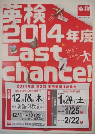10月11日(土)実施の第2回検定では小学生の皆さんも多数チャレンジしました。英語科教員の話によると、一つ上の級までもう一歩という児童生徒も多いと聞いています。今年度は今回が「Last Chance!」です。積極的に挑んでみましょう。