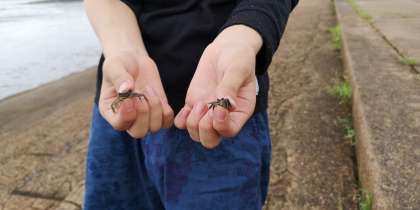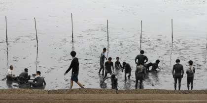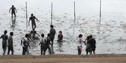 競技の合間で休憩です。みんなドロドロになって楽しんでいます。浜辺にはカニもたくさんいます。
