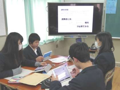 9年2組は美術【写真中】。「バルサ材での人形づくり」の授業でした。材料や見本作品の画像をさまざまな角度から提示することで、生徒たちの立体表現をしていく、彫造の発想もより豊かになっているようでした。9年1組は社会【写真右】。「わたしたちのくらしと経済」の単元で、消費者の権利について考える課題解決学習を、グループでの話し合いを取入れて発表をしていました。