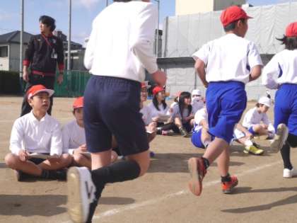 3・4年生は、中トラック(160m)を6周半。約1,000mの距離を2班に分けて交互にスタート。ペアを組んだ仲間に対して、声援を送っていました。ゴールと同時に渡される着順カードの記入は、読みあげタイムと着順の整合性が図れるようにと、先生がチェックをしていました。やはり、学年があがるにつれ、個々の能力に応じたペース配分もうまくできるようになるため、好記録も出ていました。