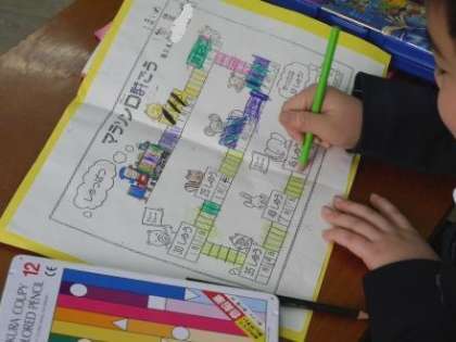 1年生の教室では児童たちが、「マラソンD51ごう【写真右】」のプリントに、達成感を得た表情で、最後の色塗りをしていました。中学年では、大阪市内の駅をどこまでたどり着いたかを比べ合っていたり、高学年では、阪急京都線をどこまで駆け抜けたかを、それぞれの児童が記していました。