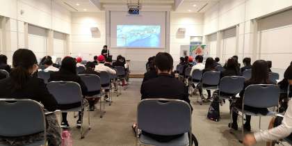公園めぐりが終わり、広島平和記念資料館の地下の会議室で山岡さんの被爆体験伝承のお話を聞いています。