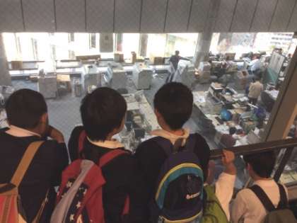 正面玄関で記念撮影をし、まずは見学ロビーで「新聞ができるまで」の作成ビデオを見て、全体イメージを抱いた後、各フロアをクラスごとに見学していきました。最初に訪ねたのは情報調査部。新聞記者が利用する膨大な図書や写真などが収蔵されていました。次に見学をした編集部では、今まさに、今日の夕刊の編集作業中でした。その後、地下に移動し、大きな窓越しに高速の輪転機で印刷されていく新聞に、児童たちは驚きの声をあげていました。