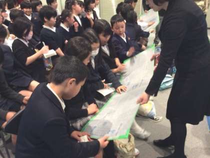 1月27日(火)午後、天候は快方に向かいました。5年生は早めの昼食を済ませ、北区梅田にある毎日新聞大阪本社の見学に行きました。