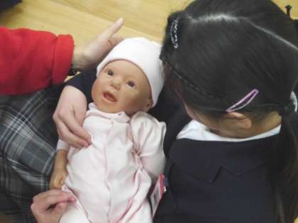 「私はだれからうまれてきたの?」「折り紙の穴くらい、はじめはとても小さないのち【写真中】」「おかあさんのおなかはパンパン」など、赤ちゃん誕生までの不思議について、スライドや絵で説明していただきました。また、自分のいのちを守るため、からだを大切にすることや、危険から身を守る断り方なども教えていただきました。最後は、赤ちゃんを代わる代わるだっこしていました。