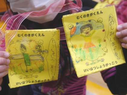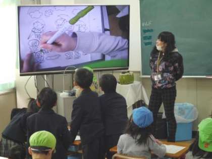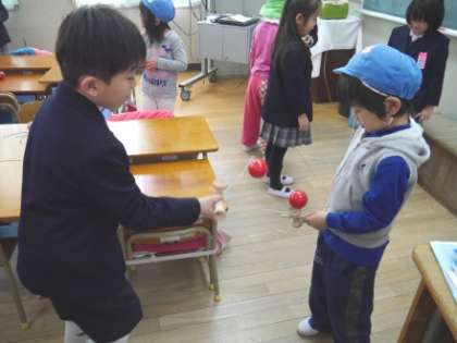 体育館でのお出迎えは、児童たちが立派なセレモニー。じゃんけん列車で仲良くなった後、2つの教室へエスコート。「なぞってみよう」(国語)や「なかまあつめ」(算数)といったお勉強を、園児もプリントやICT機器を使って行いました。また、教室では、歌やおどり、「むかしあそび」(けん玉・こま・ヨーヨー・おてだまなど)を一緒に楽しんでもらいました。最後は体育館で、クイズや質問コーナー 、手づくりのプレゼント渡しなど、今回も1年生は心からのおもてなしができました。