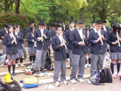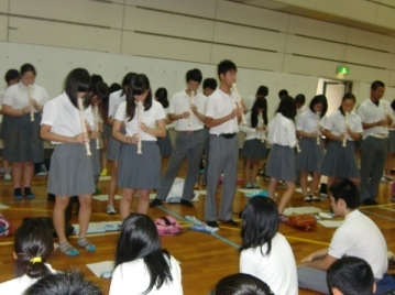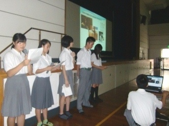 中学生からは、四者活動の報告後、3年生が修学旅行を訪ねた長崎の平和記念公園【写真中】にて、リコーダーで合奏した「平和の旅へ」を披露しました。