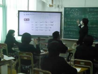 数学の授業。 多項式の展開を「分配法則」を使って行っています。