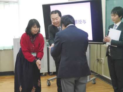3月5日(水)放課後、『むくのき学園』の課外活動の一つである、中学校民族クラブ「チョソン子ども会」では、9年生の3名の生徒に修了証が渡されました。