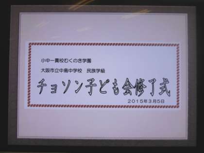 小中一貫校として開校するまでは、啓発小学校の「ヘバラギキョシル」中島中学校の「チョソン子ども会」のつながりが、あまりつくれていませんでした。しかし、今年度からは、発表や活動などでは、1年生から9年生までの児童生徒が結集し、多くの取組みを進めることができました。長年、民族講師や保護者会のご協力をいただきながら、活動してきた民族クラブも来年度は、40周年を迎えます。今日のような感動的な式を大切にしていって欲しいものです。
