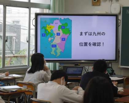 本時の目標は「自然環境に注目して、九州の産業がどのように発達したかまとめられる」です。