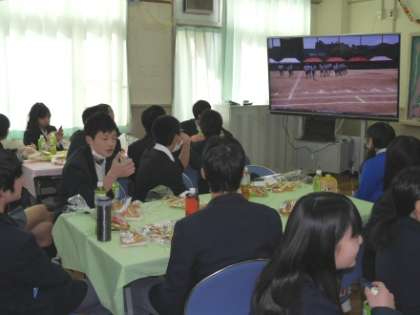 5号館の体育館で、1組と2組に分かれて「しっぽとり」「大縄跳び」などのゲームを行い、全員でフォークダンスをして、楽しいひと時を過ごしました。その後、視聴覚室で、1年間の回想ビデオを見た後、卒業生一人ずつが今までの思い出を語り、「64期生から先生へ」のビデオメッセージが映写され、大いに盛りあがりました。最後は、9年生担当の先生方から卒業生へのメッセージが述べられ、名残は尽きなかったようですが、笑いあり、涙ありの茶話会を終えました。