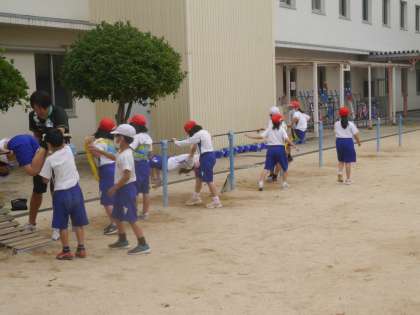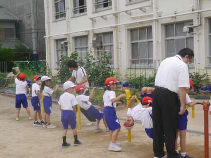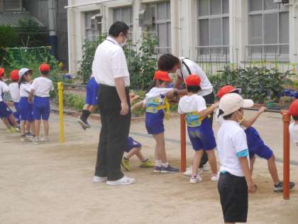2年生が運動場と中庭に分かれて鉄棒運動をしています。
