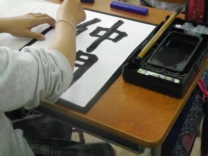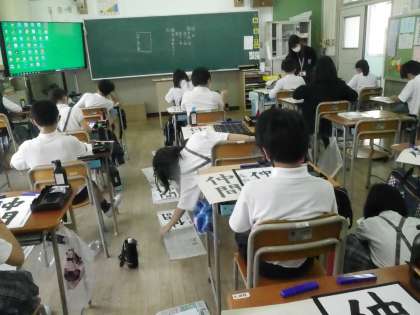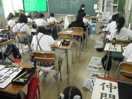 6年生が習字で「仲間」という文字を書いています。さすが6年生になるとしっかりとした字が書けるようになりました。ずいぶん成長しましたね。