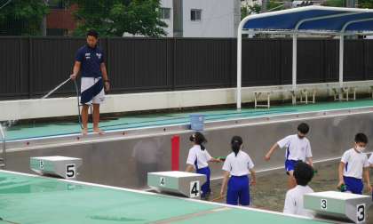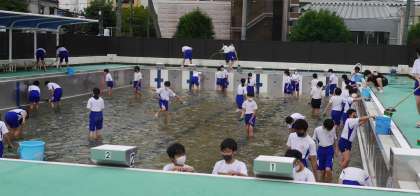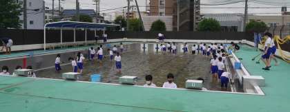 中学生は曇りや雨のなか、プール清掃を行いました。