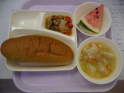 本日の給食 ・鶏肉と夏野菜のソテー ・押麦のスープ ・すいか ・パン ・牛乳