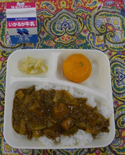 本日の給食 ・夏野菜のカレーライス ・キャベツのサラダ ・みかん ・牛乳
