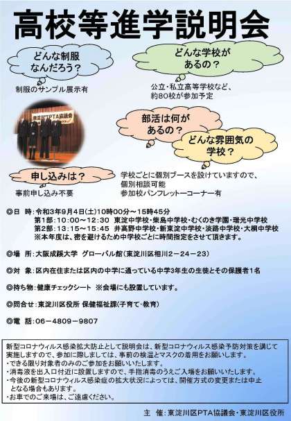 新型コロナウイルス感染症予防の為、色々と大変な時期ではありますが、東淀川区PTA協議会において下記の要領で「高校等進学説明会」を開催する運びとなりました。