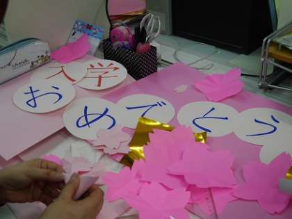 4/3(金) あいにくの空模様に、満開の桜がいつまで咲き誇ってくれるか心配されます。たくさんの新しい仲間たちが加わる入学式は、明るい笑顔を誘う満開の桜花で迎えたい気持ちです。さて、昨日までの会議は一段落。職員室や教室では、新しいクラスで出会うみなさんの素敵な笑顔を思い浮かべながら、たくさんの先生が熱心に作業をしていました。少しでも明るく優しい気持ちで学校生活が送れますように---少しでも困ることなく学校生活が送れますように---そんな先生たちの思いを込めた教室環境づくりの作業です。月曜日には、式場の準備など、いよいよ入学式本番にむけた準備に力を合わせて取り組みます。