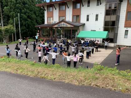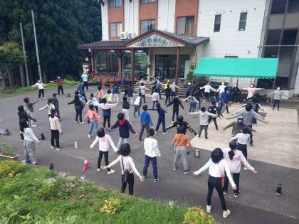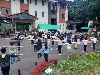 各班の副班長が前に出て、『わたしたちの体操はかんぺきなので、わたしたちを見本に元気よく体操しましょう!!』と、ラジオ体操の指揮をしています。
