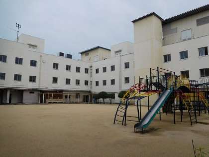 児童・生徒の声がなく、中庭の遊具もさびしそうです。