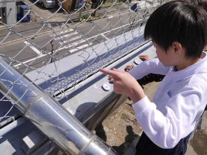 先週4/17(金)、1・2年生が「学校たんけん」をしているのと同じ頃、3年生のみなさんは気持ちよく晴れた校舎の屋上に上り、社会科の授業で学校周辺の町のようすを調べていました。方位磁石で東西南北をはかり、それぞれの方角にどのようなものが見られるかを調べます。身近な町のようすですが、視点を変えてみると日頃は気づかないさまざまなことに気づきます。