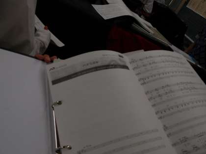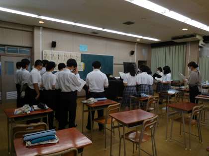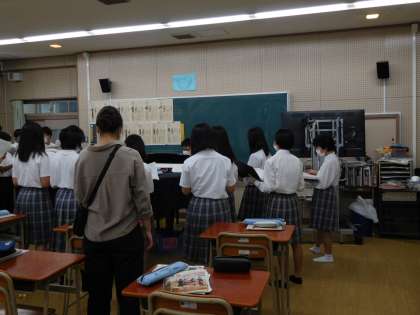 8年生が第2音楽室で3部(男声1部・女声2部)に分かれて「ハナミヅキ」を合唱しています。