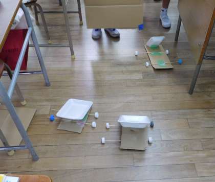 材料は段ボール、食品トレー、竹ひご、ペットボトルのキャップなどです。
