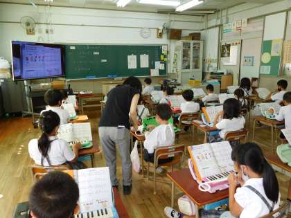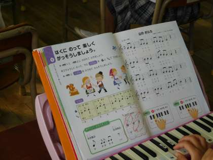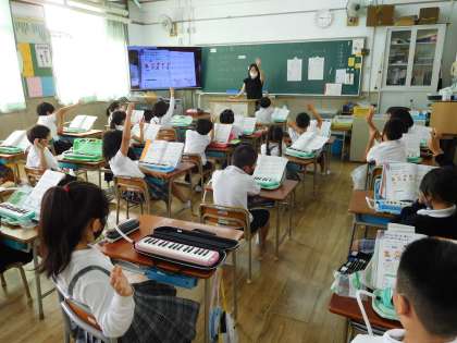 2年生が音楽の時間に「はくにのって楽しくがっそうしましょう」で鍵盤ハーモニカを使っています。