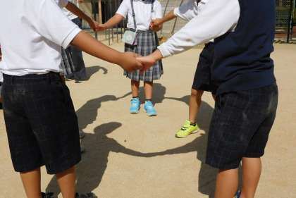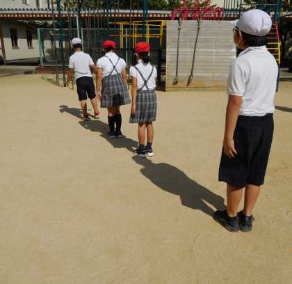暑い中でしたが、班で手をつなぎ丸を描いたり、太陽に背をむけて長い影をつくったりできました。