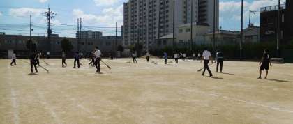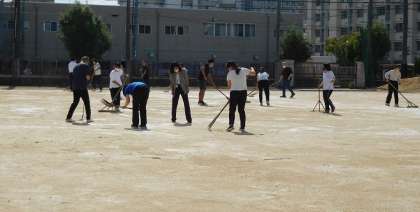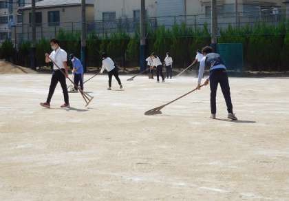 土曜参観のあと、教職員で運動場と中庭に「にがり」をまきました。