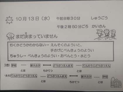 明日、10月13日(水)の校外学習における、天候に伴う対応について