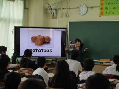 4月28日(火)、7年生の英語の授業では、みんなで歌を英語で歌いました。今朝の天気のように、すがすがしく美しい歌声が教室に響きわたりました。続いてICT教材 を用いて、野菜など食べ物の単語の発音の練習です。先生からの問いかけや、会話もすべて英語で進められるので、子供たちが自然と英語を話せるようになる取組みです。先生も3名体制で、英語教育重点校 ならではの授業風景です。
