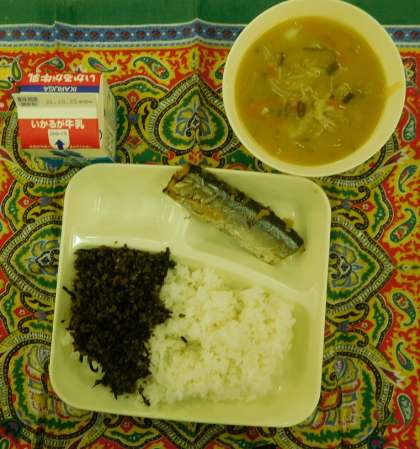 本日の給食 ・さんまのみぞれかけ ・みそ汁 ・牛ひじきそぼろ ・ごはん ・牛乳