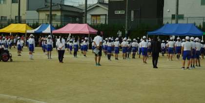 まずは、午前前半の部(1・3・6年)について、開会式の集合と運動委員会による準備体操です。