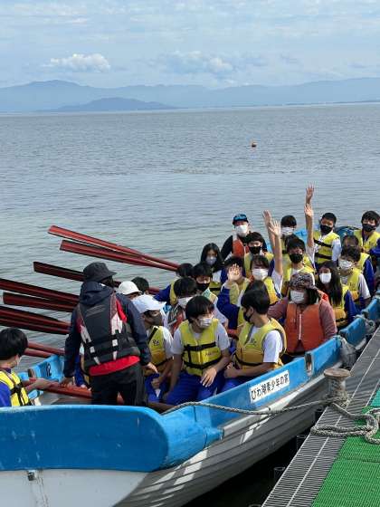 桟橋で「かい」の使い方や漕ぎ方について説明を受けている様子です。