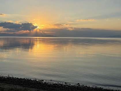 今朝の琵琶湖は晴天で気温は10度と少し寒いものの、湖畔は昨日と同様に穏やかなで、たくさんの鴨が優雅に泳いでいます。