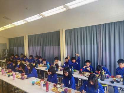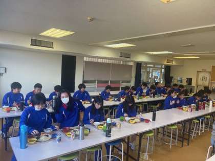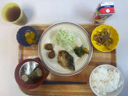 朝食は、白ごはん、みそ汁、鯖の塩焼き、ミートボール、ほうれん草のおひたし、きんぴらごぼう、みかん、ジュースです。