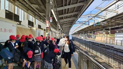 9時9分発の、ひかり673号に乗車します。小学生の団体がたくさん集まっています。