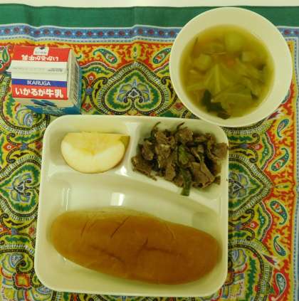 本日の給食 ・牛肉のオイスターソース焼き ・中華スープ ・パン ・牛乳 ・りんご